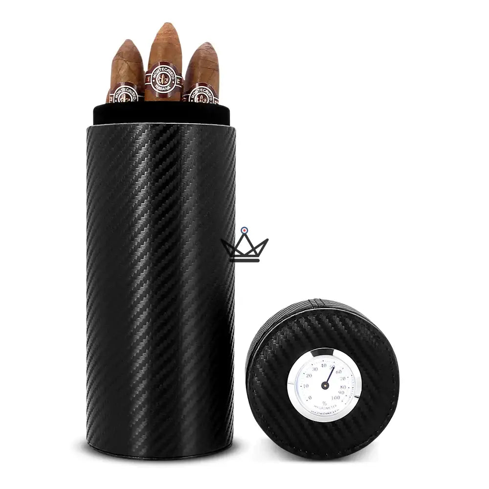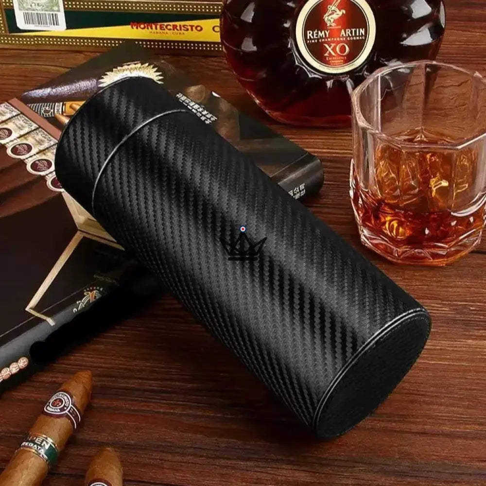 Avec son design cylindrique distinctif, l'Orbal Carbon s'adresse aux passionnés de cigares en quête d'une solution compacte et stylée pour conserver leurs cigares préférés.