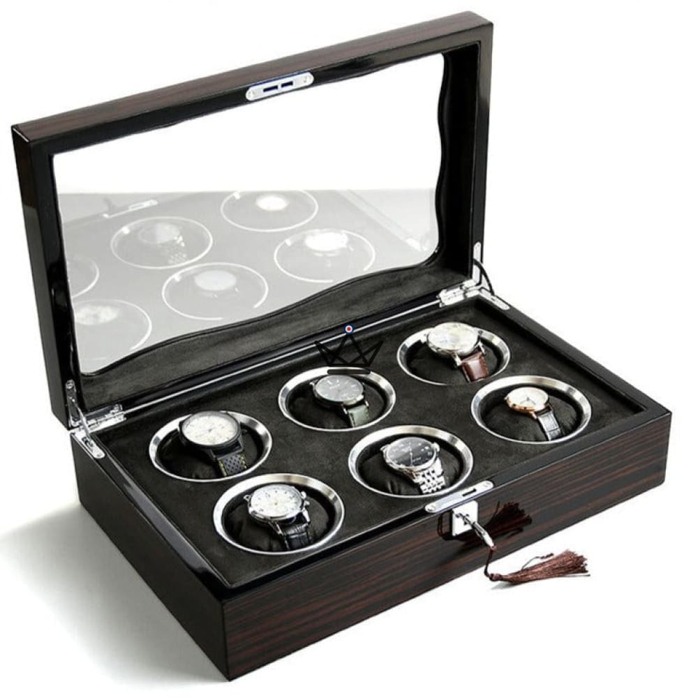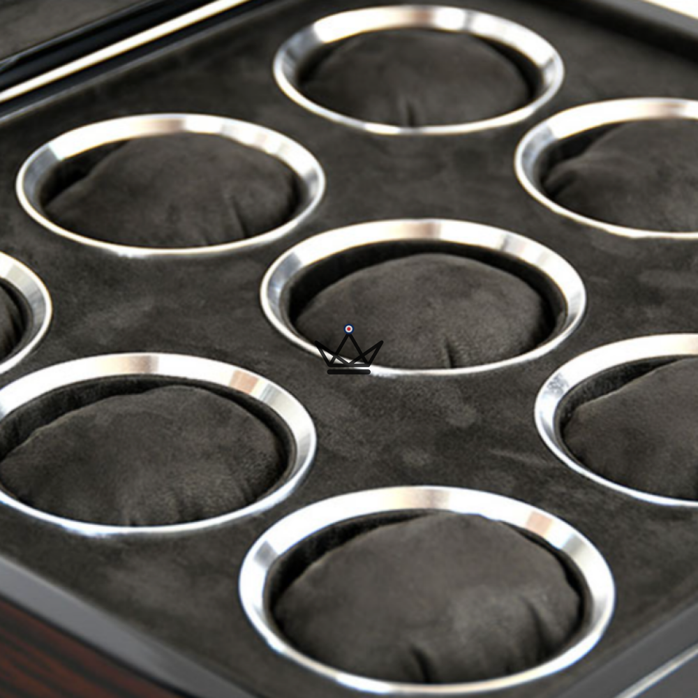 Chaque emplacement pour montre est cerclé d'un cercle de métal brillant qui ajoute une touche de luxe à la boîte. Les montres sont maintenues en place avec un mécanisme de retenue doux pour éviter tout risque de rayure ou de dommage.