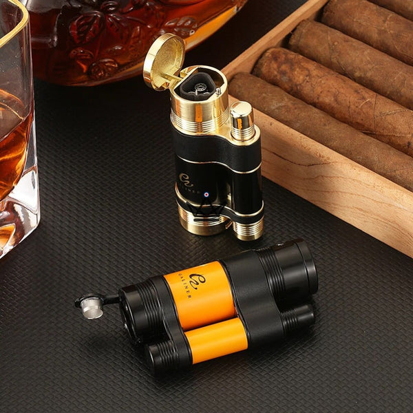Entdecken Sie das Taschenlampenfeuerzeug TOWER, das ultimative Zubehör zum eleganten und präzisen Anzünden Ihrer Zigarre. Dieses Feuerzeug ist mit drei leistungsstarken, verstellbaren Fackeln ausgestattet und bietet eine kraftvolle und gleichmäßige Flamme, die jedes Mal für die perfekte Zündung sorgt.