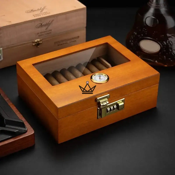 Entdecken Sie den Zigarren-Humidor im Enigma-Stil , eine Innovation, die Eleganz und Sicherheit für Zigarrenliebhaber vereint. Dieser Humidor verfügt über ein elegantes Glasdesign, einen Geheimcode-Verschlussmechanismus und ein integriertes Hygrometer im Deckel und ist die ideale Wahl für alle, die ihre Zigarren vornehm schützen und präsentieren möchten.