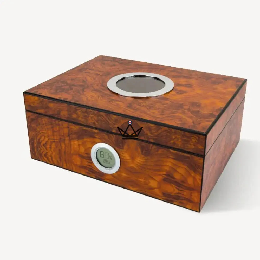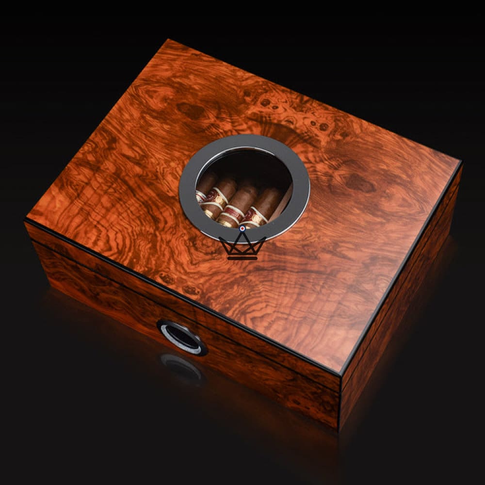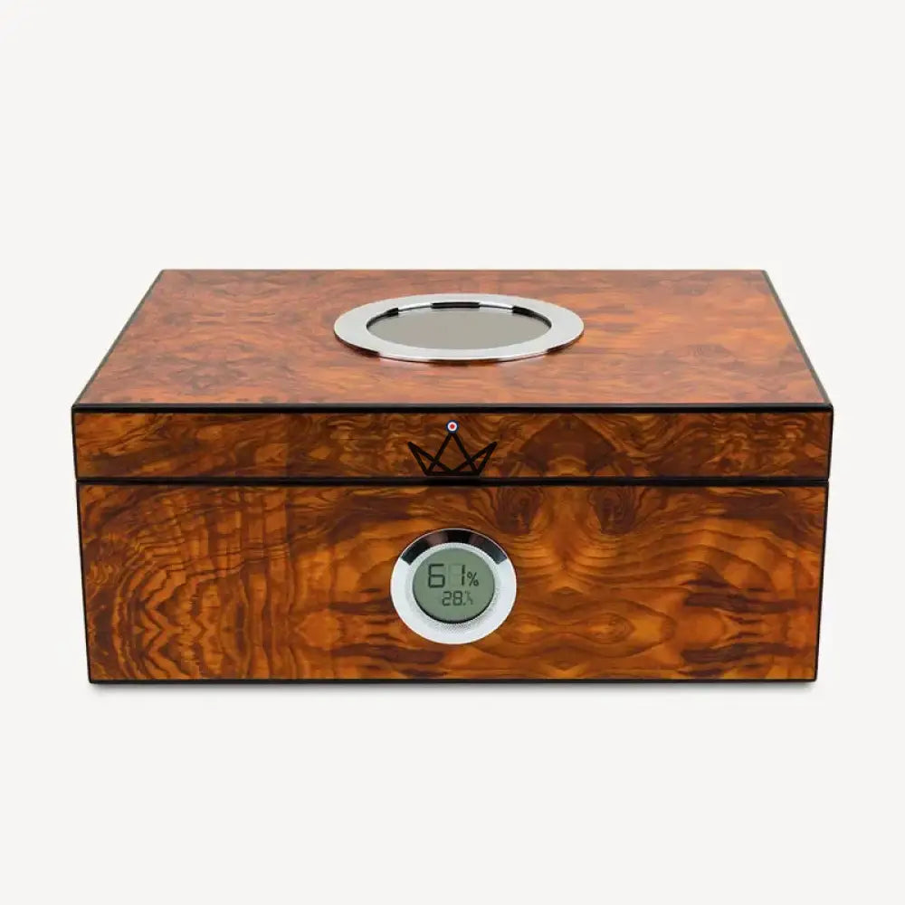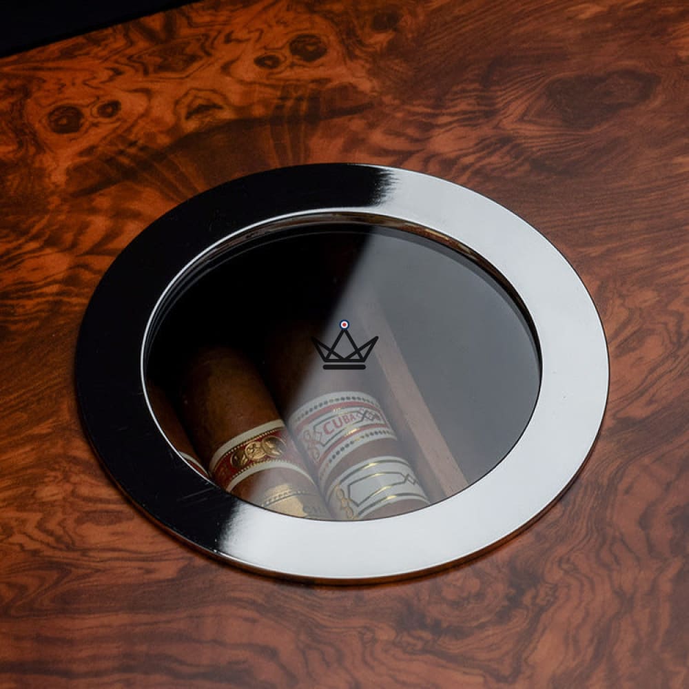 Sein schlichtes und elegantes Design, das durch ein gemasertes Holzfurnier in Wurzelholzoptik aufgewertet wird, zeichnet sich durch ein einzigartiges Detail aus: ein rundes Bullauge im Deckel, durch das Sie Ihre Sammlung betrachten können, ohne die Box öffnen zu müssen. So können Sie Ihre Cohiba , Montecristo , Romeo y Julieta , Partagás oder sogar Hoyo de Monterrey überwachen, ohne deren Konservierung zu gefährden.