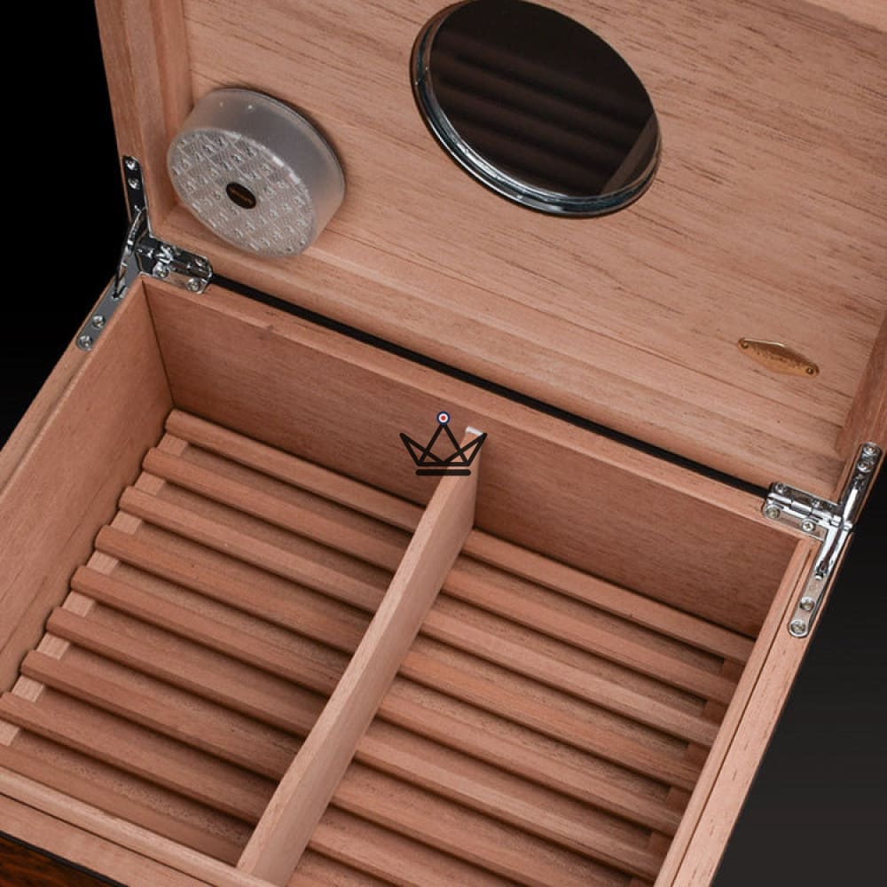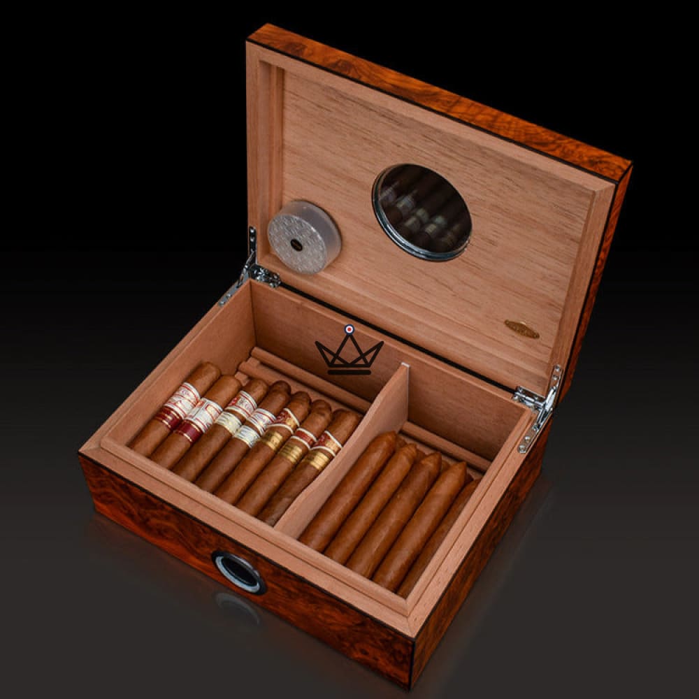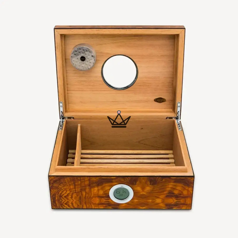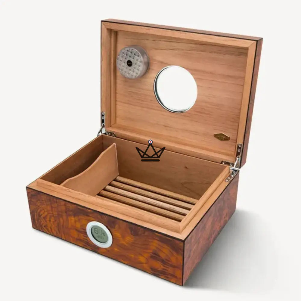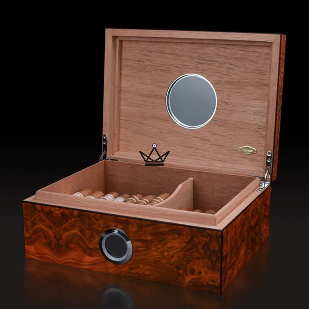 Sein schlichtes und elegantes Design, das durch ein gemasertes Holzfurnier in Wurzelholzoptik aufgewertet wird, zeichnet sich durch ein einzigartiges Detail aus: ein rundes Bullauge im Deckel, durch das Sie Ihre Sammlung betrachten können, ohne die Box öffnen zu müssen. So können Sie Ihre Cohiba , Montecristo , Romeo y Julieta , Partagás oder sogar Hoyo de Monterrey überwachen, ohne deren Konservierung zu gefährden.