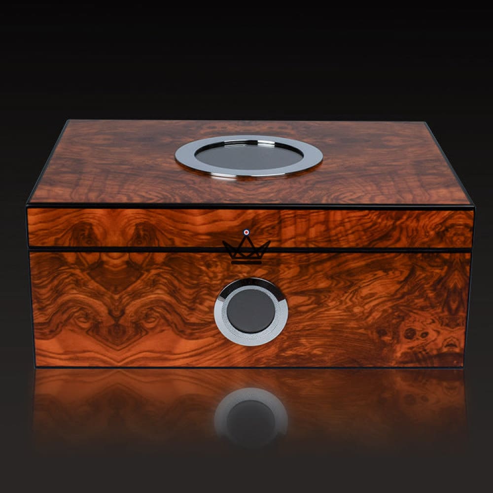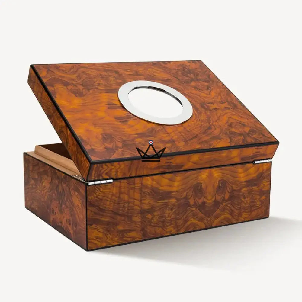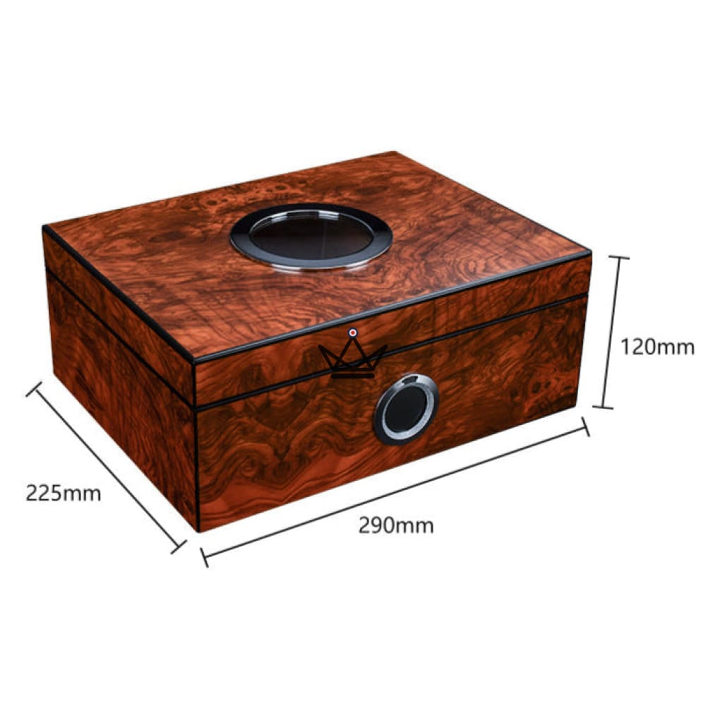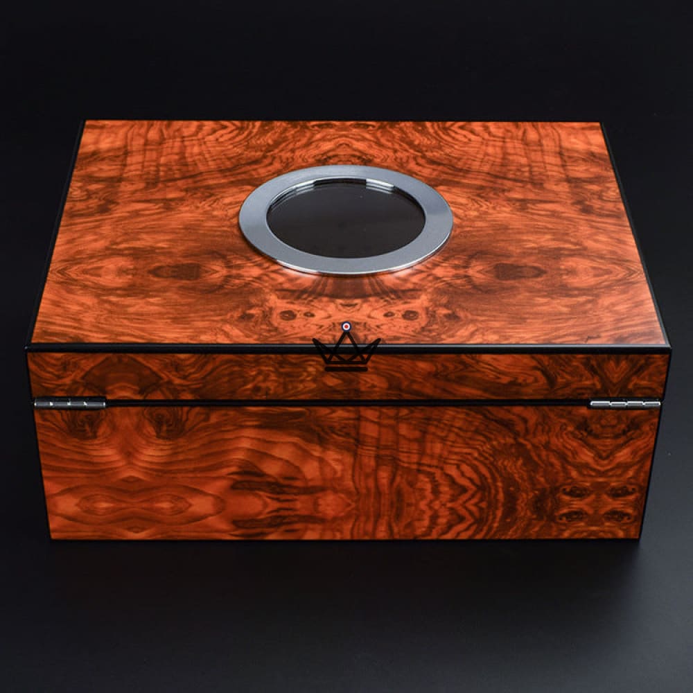 Sein schlichtes und elegantes Design, das durch ein gemasertes Holzfurnier in Wurzelholzoptik aufgewertet wird, zeichnet sich durch ein einzigartiges Detail aus: ein rundes Bullauge im Deckel, durch das Sie Ihre Sammlung betrachten können, ohne die Box öffnen zu müssen. So können Sie Ihre Cohiba , Montecristo , Romeo y Julieta , Partagás oder sogar Hoyo de Monterrey überwachen, ohne deren Konservierung zu gefährden.