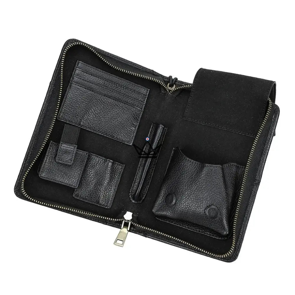 Praktische Aufbewahrung: Für zusätzliche Praktikabilität ist diese Tasche mit zwei Außentaschen ausgestattet. Eine vordere Reißverschlusstasche bietet zusätzlichen Platz für die Aufbewahrung von Zubehör wie Streichhölzern oder zusätzlichen Zigarrenschneidern. Auf der Rückseite befindet sich eine offene Tasche, in der Sie Dokumente oder andere wichtige Gegenstände verstauen können.