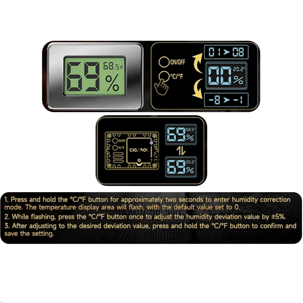 Inside, a natural cedar wood tray promotes aging and aroma diffusion. The calibrable digital hygrometer ensures precise humidity monitoring, adjustable to your preference. The discreet and efficient gel humidifier gradually releases the necessary moisture to maintain your cigars in ideal conditions.