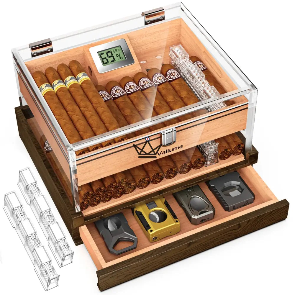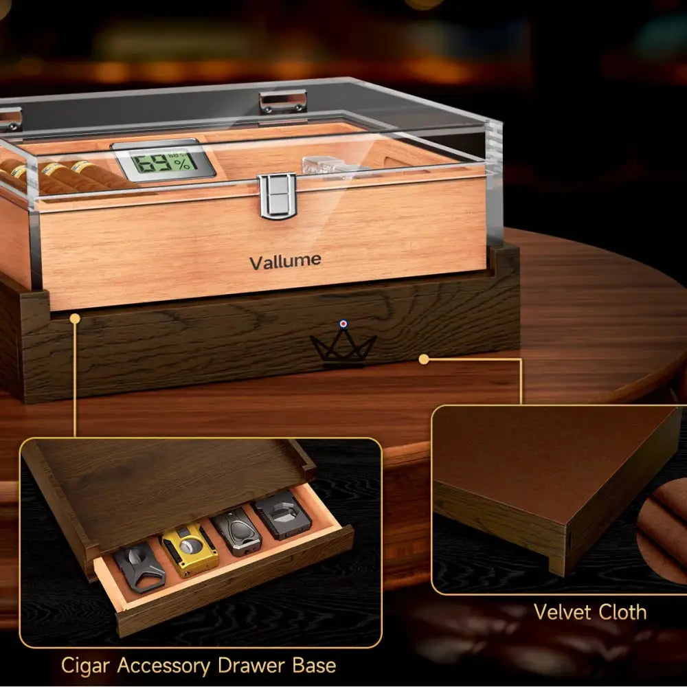 Immerse yourself in the world of pure luxury with Aerion Vault , an exceptional cigar humidor that combines modern aesthetics with superior preservation performance. This humidor blends a transparent acrylic structure with a dark wood base , offering a 360° panoramic view of your favorite cigars, while ensuring optimal preservation thanks to its high-end components.