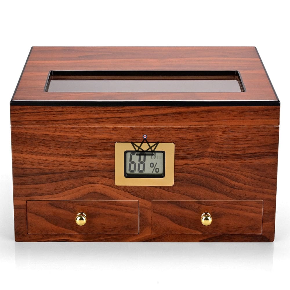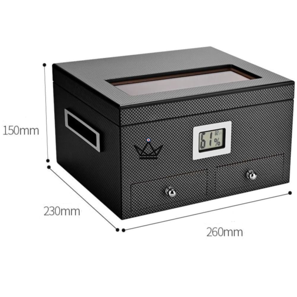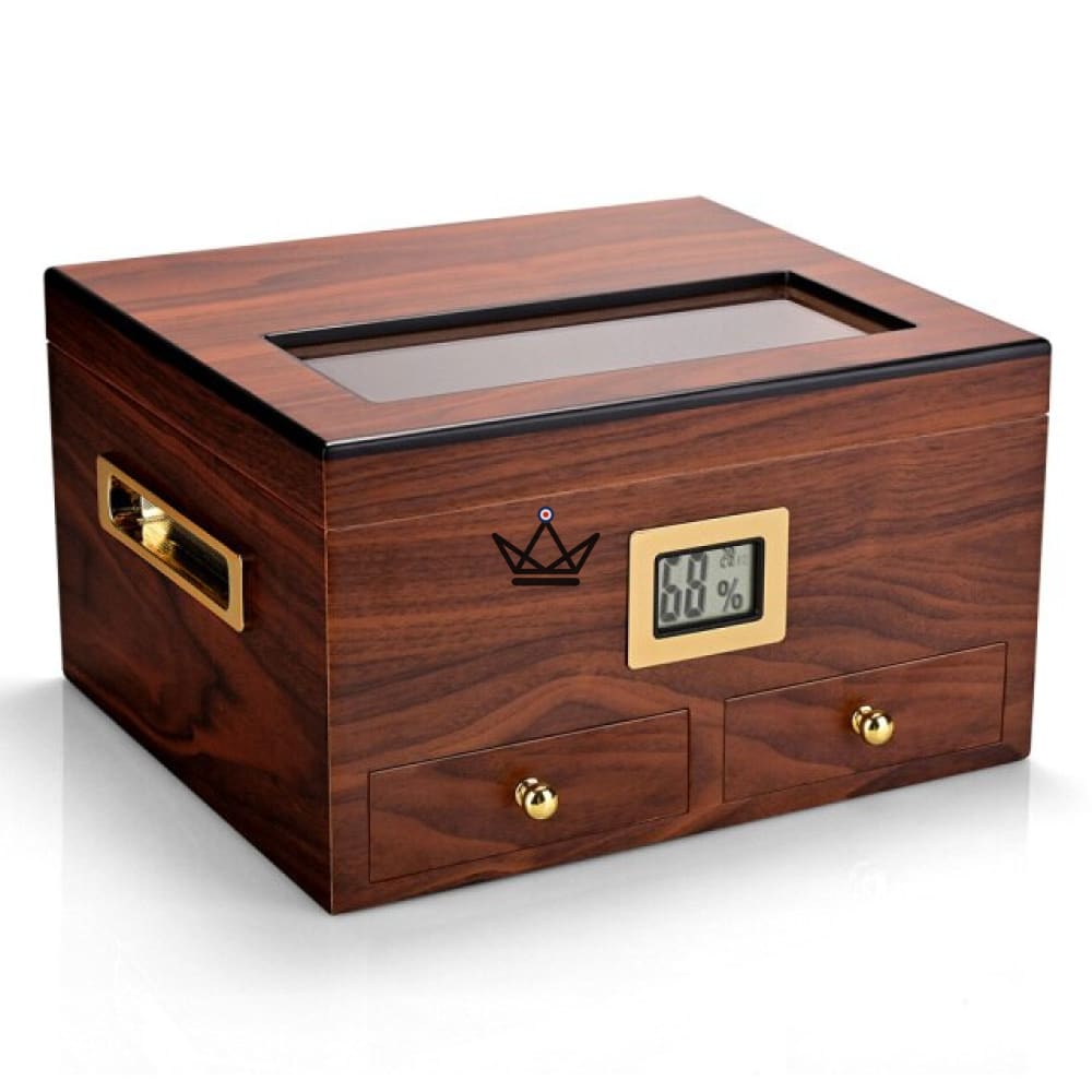 Glass on its lid, and with two drawers on the front, this unique cigar box will delight you with its perfection.