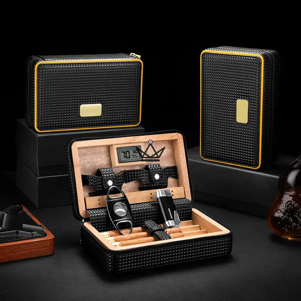 Conçu pour contenir jusqu'à cinq cigares (avec un anneau de 55), le coffret comporte également des espaces intégrés pour un briquet et un coupe-cigare, assurant que vous êtes parfaitement équipé pour profiter de votre rituel du cigare, que vous soyez en voyage d'affaires ou en escapade de fin de semaine.