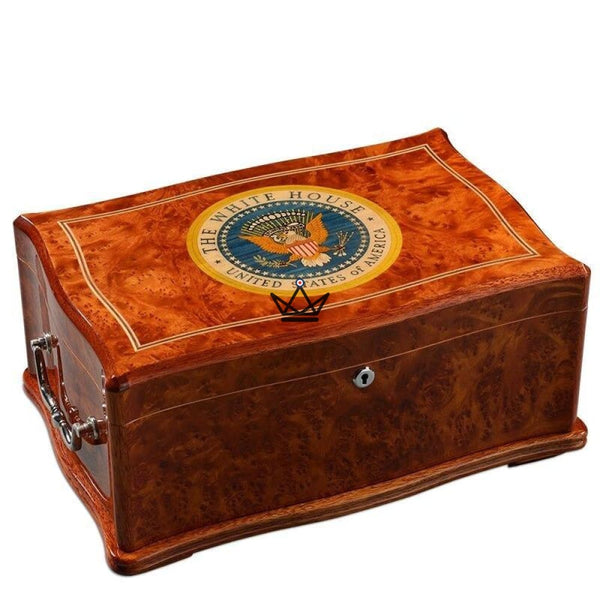 Transportez-vous jusqu'au bureau Ovale avec la Cave à Cigare de Luxe WHITE HOUSE 100, siglée de l'emblème de la Maison Blanche. Conçue pour contenir jusqu'à 100 cigares, cette cave à cigares est une pièce exceptionnelle alliant élégance présidentielle et fonctionnalité optimale.