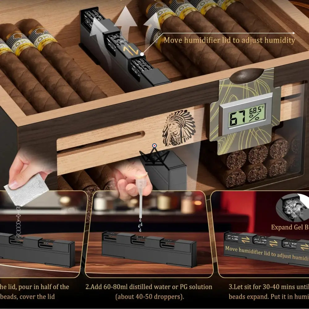 Deux hygromètres digital en façade et sur toit assure une lecture ultra-précise du taux d’humidité, tandis que deux humidificateurs à gel réglables permettent un ajustement minutieux du niveau d’humidification. Le système à billes hydrophiles garantit une diffusion lente et homogène de l’humidité, parfaite pour préserver la richesse aromatique de vos cigares.