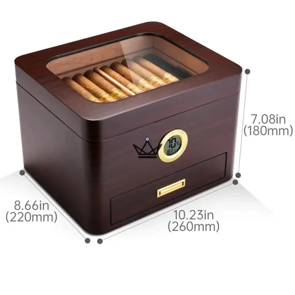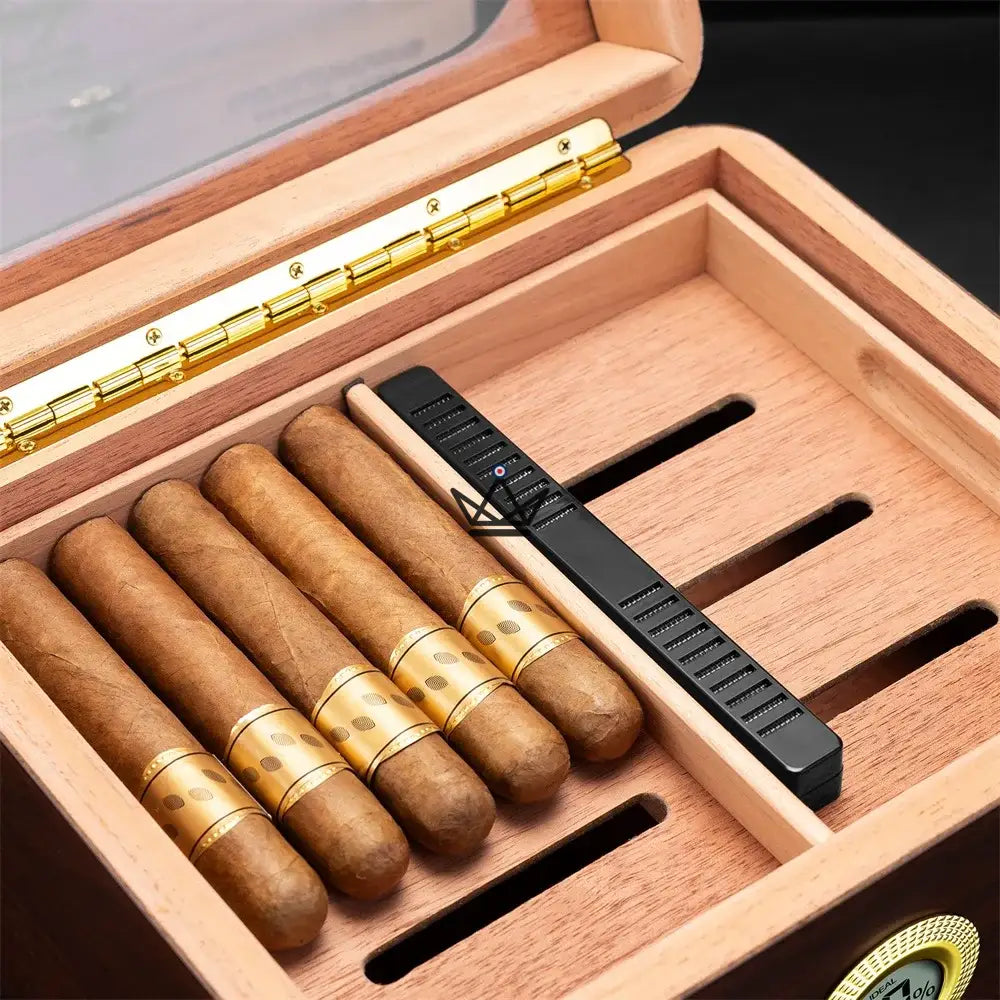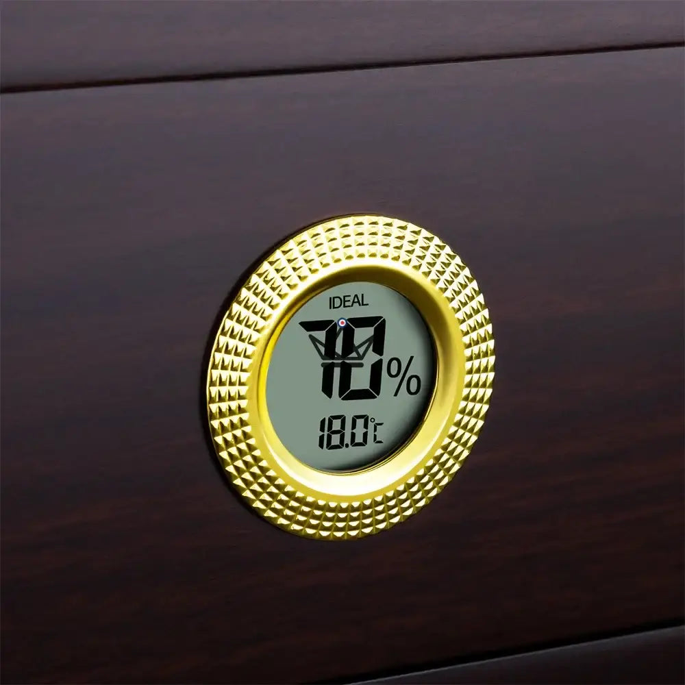 Cette cave à cigares est équipée d'un hygromètre numérique intégré, positionné à l'avant, pour une lecture précise du taux d'humidité et de la température à l'intérieur. Le joint hermétique assure une conservation parfaite, en maintenant un environnement constant pour vos cigares. Avec une capacité de stockage pouvant atteindre environ 65 cigares, l'intérieur est compartimenté pour organiser efficacement vos précieuses pièces, tout en permettant une circulation d'air optimale.