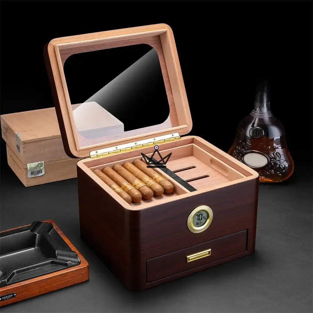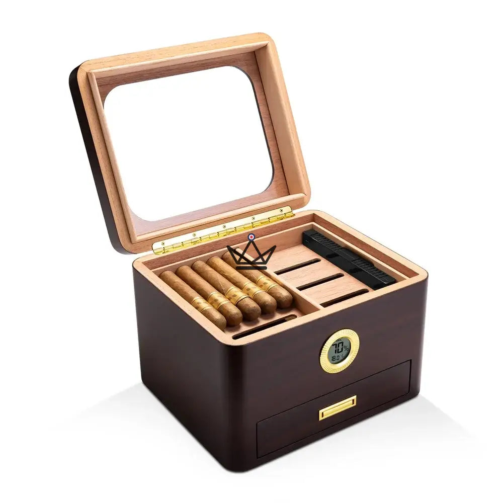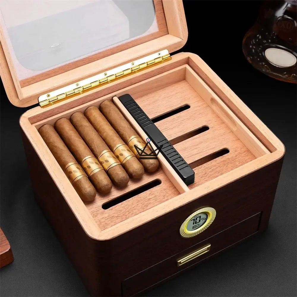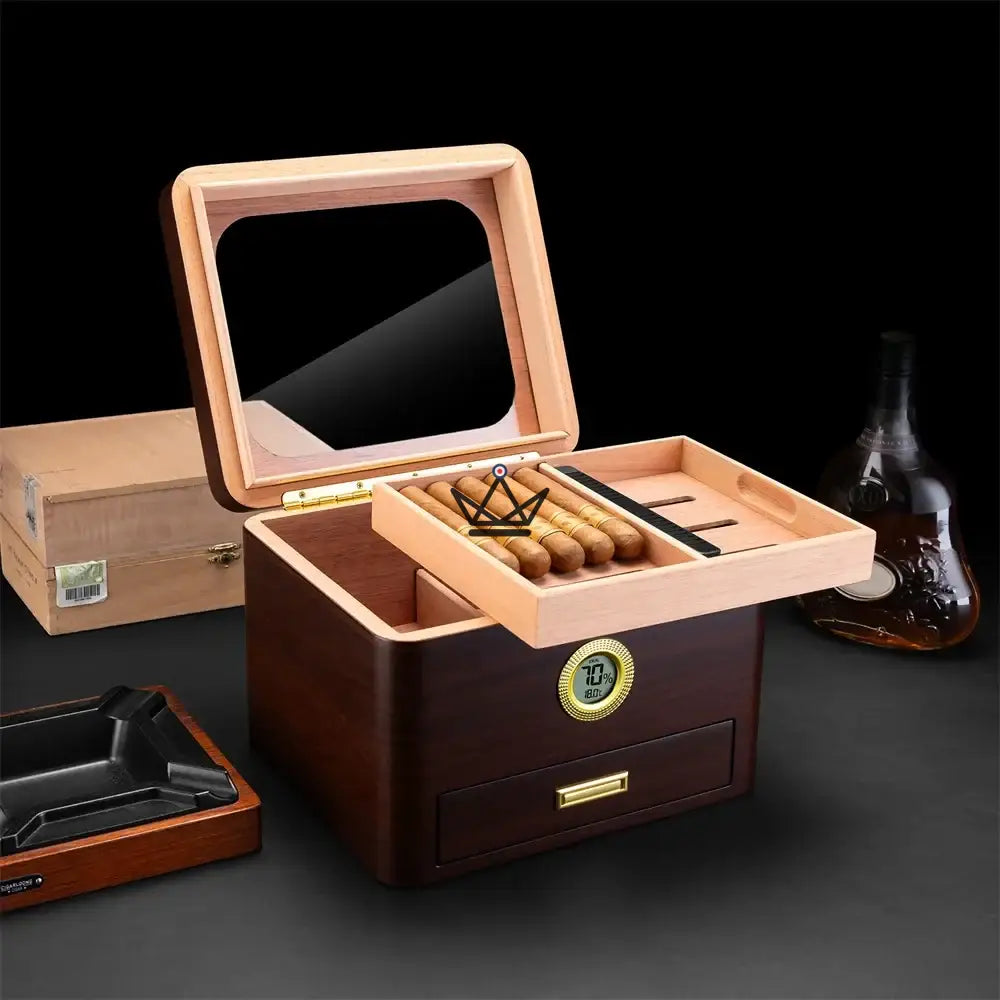 Cette cave à cigares est équipée d'un hygromètre numérique intégré, positionné à l'avant, pour une lecture précise du taux d'humidité et de la température à l'intérieur. Le joint hermétique assure une conservation parfaite, en maintenant un environnement constant pour vos cigares. Avec une capacité de stockage pouvant atteindre environ 65 cigares, l'intérieur est compartimenté pour organiser efficacement vos précieuses pièces, tout en permettant une circulation d'air optimale.