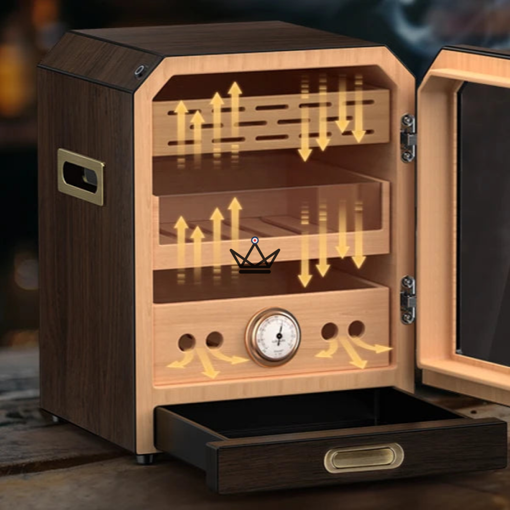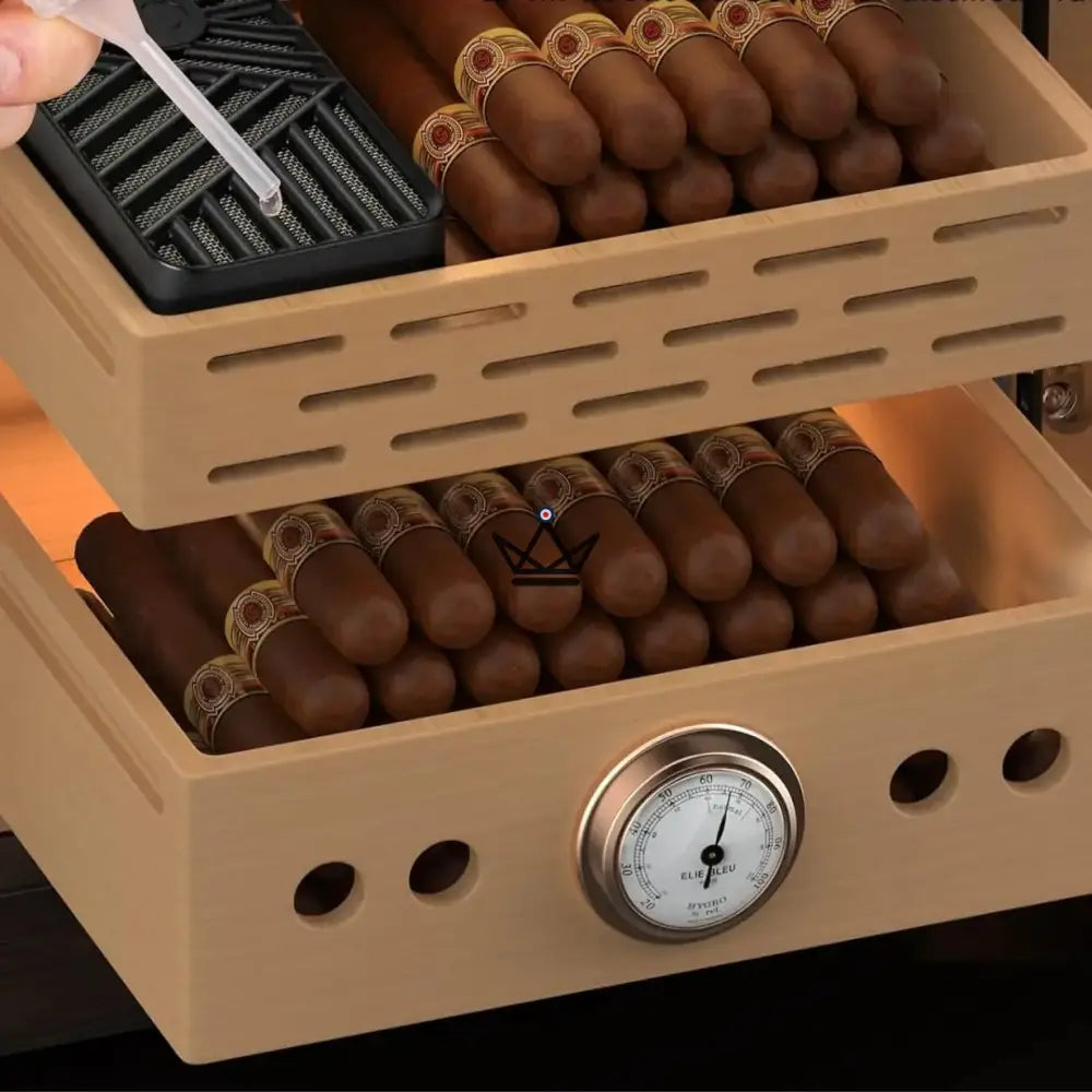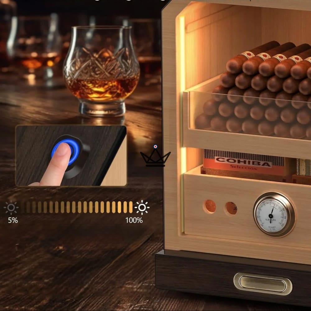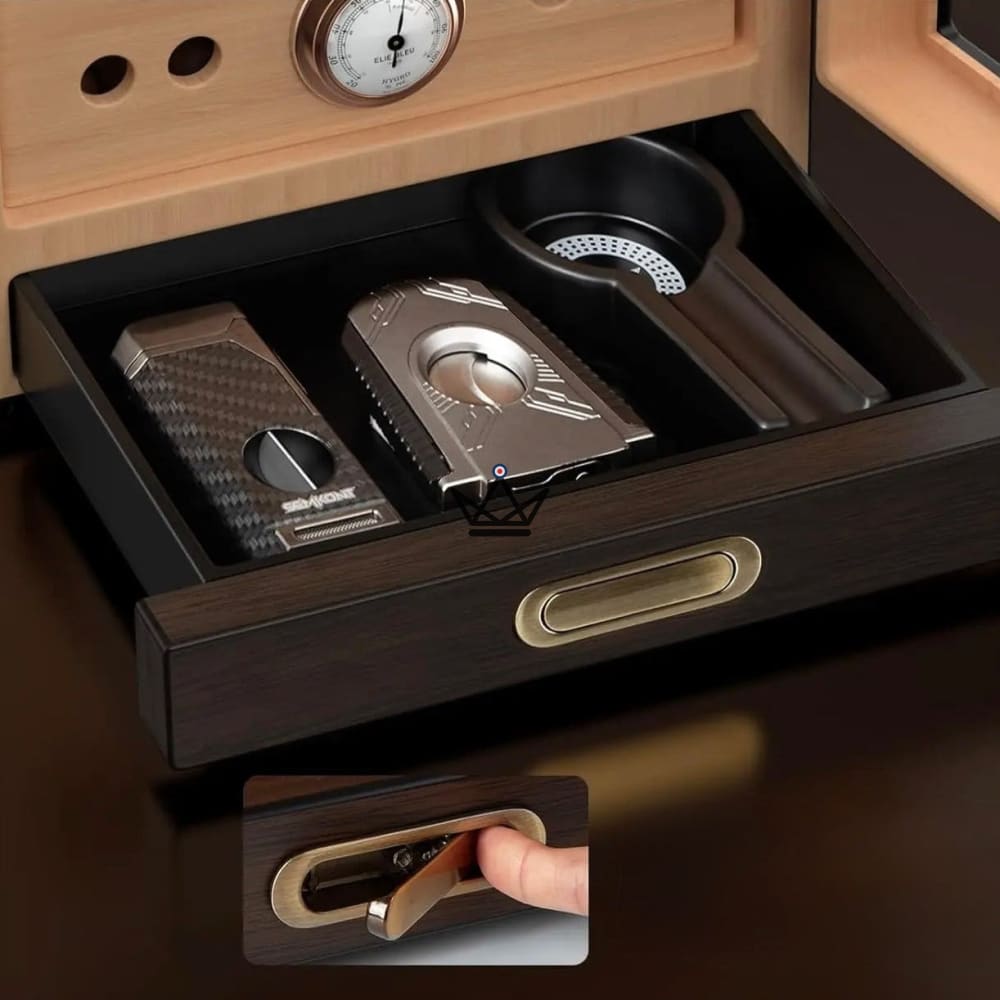 - Capacité généreuse : Accueille entre 100 et 150 cigares selon leur calibre (robusto, torpedo, corona…).