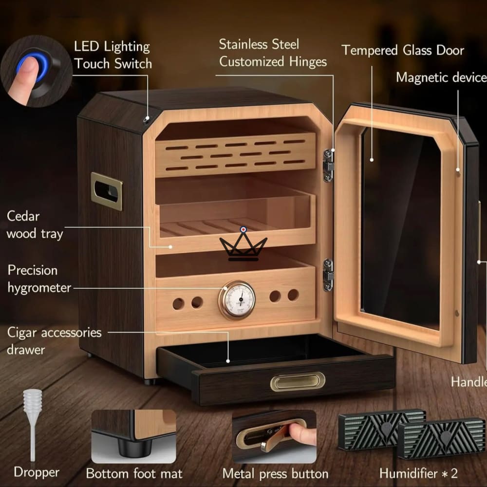 - Cette cave à cigares est idéale pour conserver les marques de renom comme Cohiba, Montecristo, Romeo y Julieta, Partagás, Bolivar, ou encore H. Upmann, dans des conditions de conservation optimales.