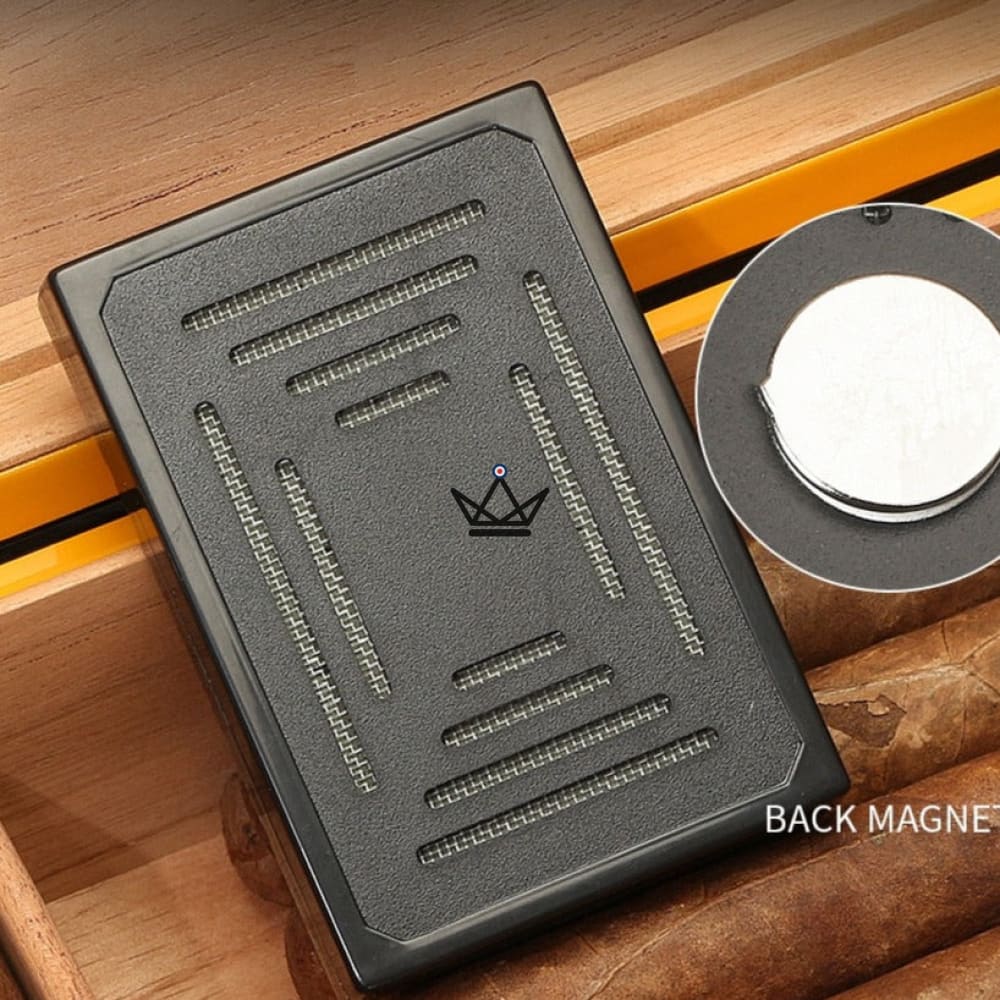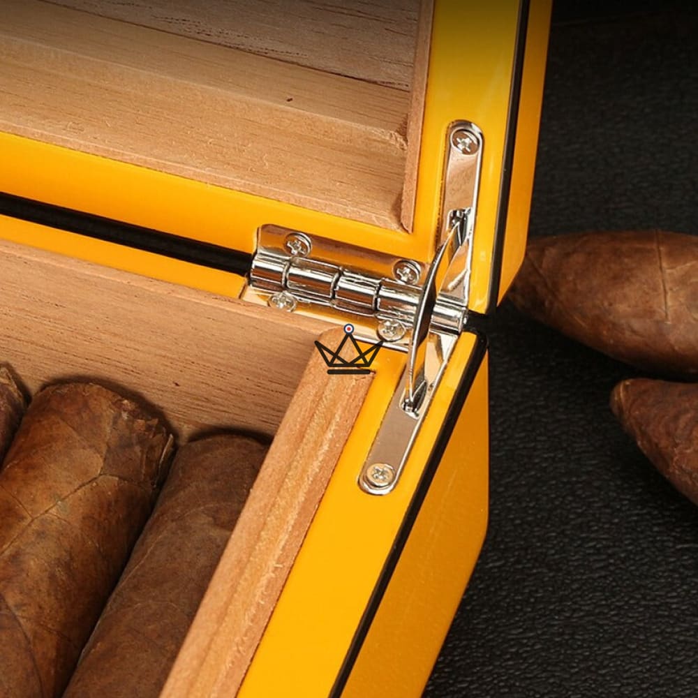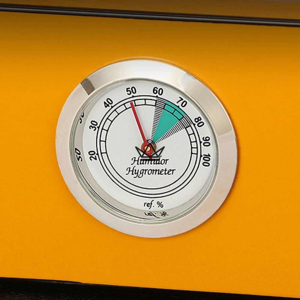 La finition brillante jaune, relevée par des bandes noires en fibre de carbon, confère à cette cave un aspect visuellement frappant qui attire l'œil. Équipée d'un hygromètre précis sur le devant, cette cave vous assure une conservation idéale de vos cigares en contrôlant l'humidité à l'intérieur de l'écrin.