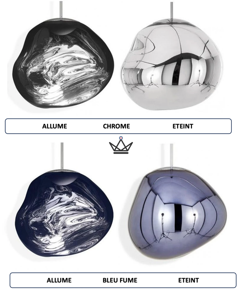 Disponible en dix coloris captivants - argent, or, rouge, pourpre, bleu, vert, et plus - et en cinq tailles différentes (15 cm, 20 cm, 28 cm, 38 cm, et 48 cm de diamètre), la suspension "Melt" offre une flexibilité décorative qui s'adapte à une multitude d'espaces et de préférences esthétiques.
