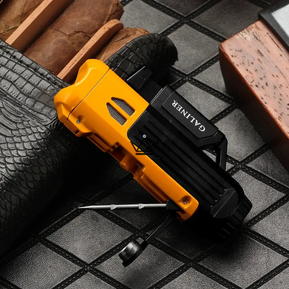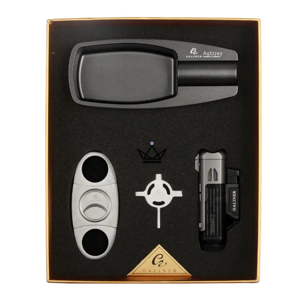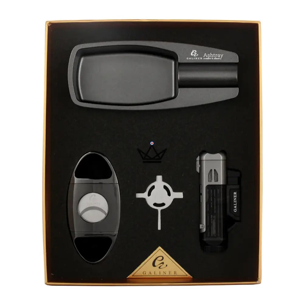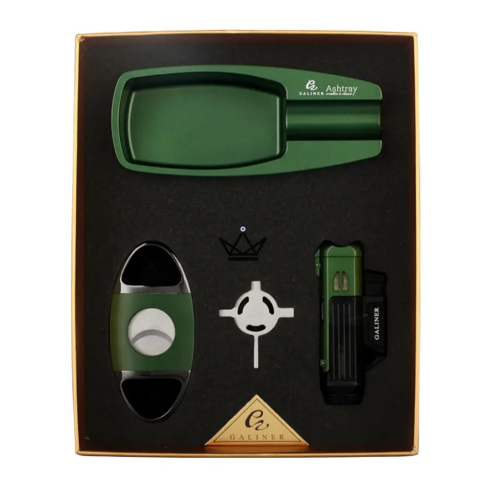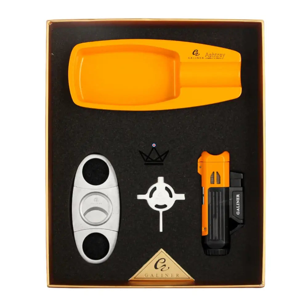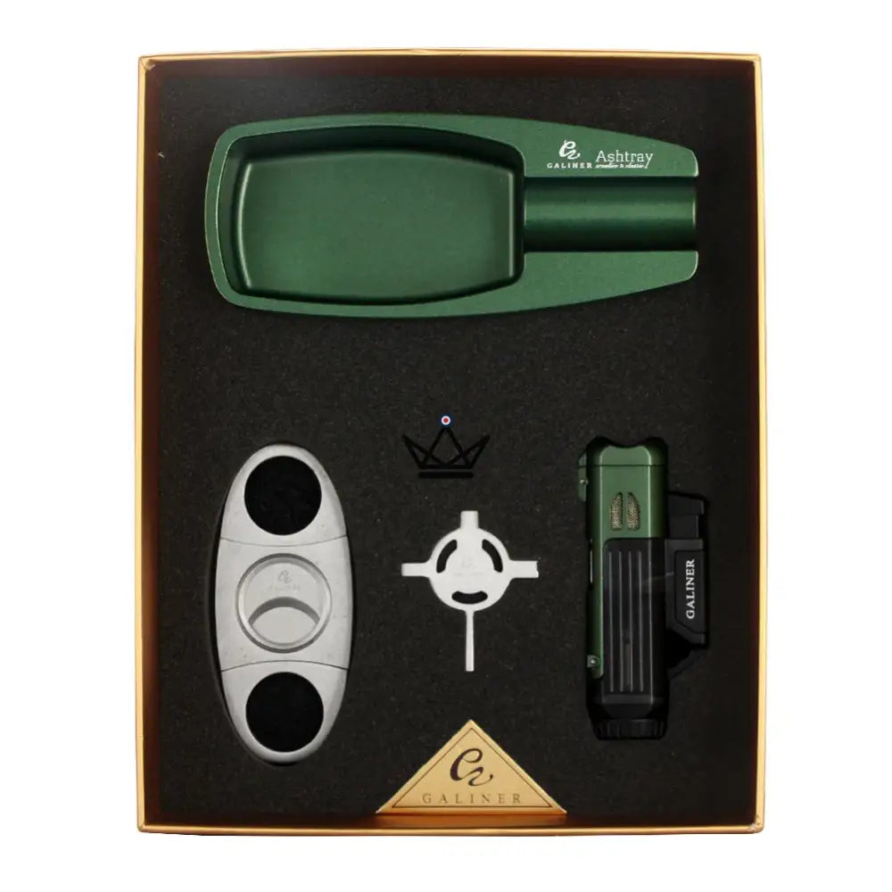 Ce pack élégant comprend un briquet torche, un cendrier de luxe et un coupe-cigare, disponible en trois couleurs raffinées : Vert Forêt, Noir Carbon et Jaune Flamboyant.