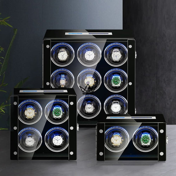 Disponible en quatre tailles et deux finitions (Noir ou Bois), ce remontoir s'adapte parfaitement à votre collection de montres de luxe, offrant une solution de rangement et de recharge élégante et fonctionnelle.